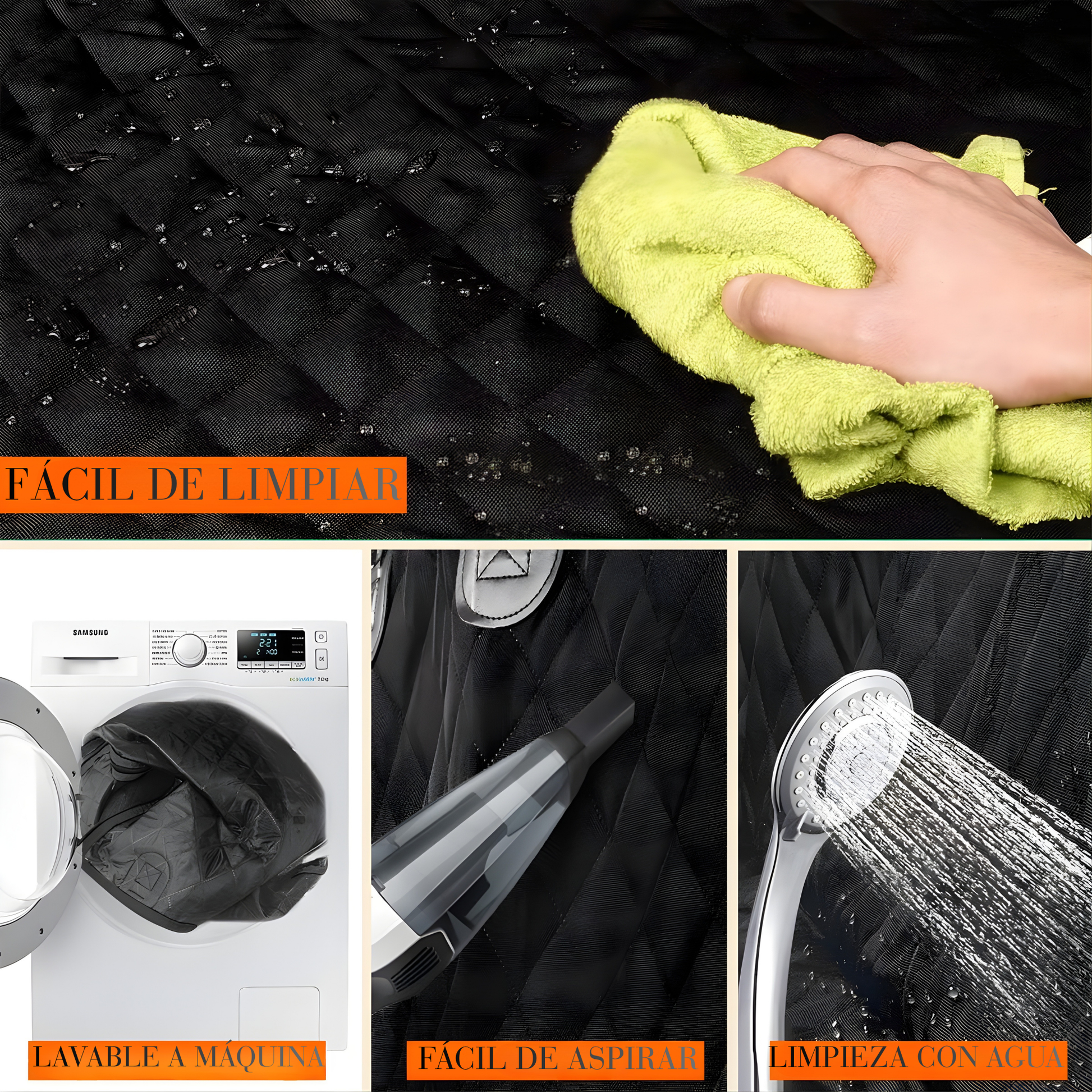 Viaja con tu perro o niños sin estrés. El material impermeable y antideslizante mantiene el asiento limpio, seco y cómodo, ofreciendo protección total y un acabado práctico para el día a día.
